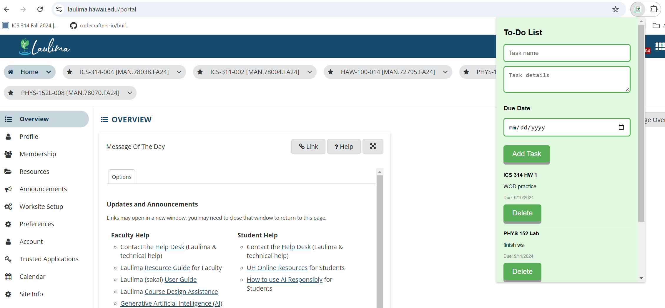 I created a Laulima Chrome extension where you can add and delete TODOs. The TODO’s input would include the homework name, the details about the homework/TODO, and finally, you can select on the calendar when the due date is for that assignment. The list is organized from the earlier due dates to the later due dates. This allows students to stay focused on the Laulima platform while keeping their assignment tracking in one place. By having everything within a single browser extension, it reduces the need to switch between devices or tabs, ensuring a smoother, more efficient workflow. With a clear visual of tasks, students can prioritize their time more effectively and avoid missing important deadlines.